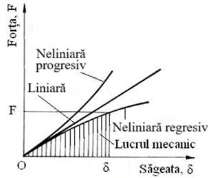 În funcţie de variaţia rigidităţii (variabilă sau constantă) caracteristicile elastice pot fi neliniare, cu rigiditate crescătoare progresiv/regresiv (arcuri tari/moi), sau liniare (arcuri liniare) cu rigiditae constantă, k =