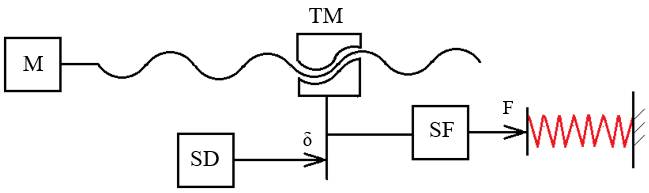 Semnificații notații: M – motor electric, TM transmisie mecanică de tip șurub-piuliță (transformă mișcarea de rotație în mișcarea de translație), SD – senzor de deplasare, SF – senzor de forță |