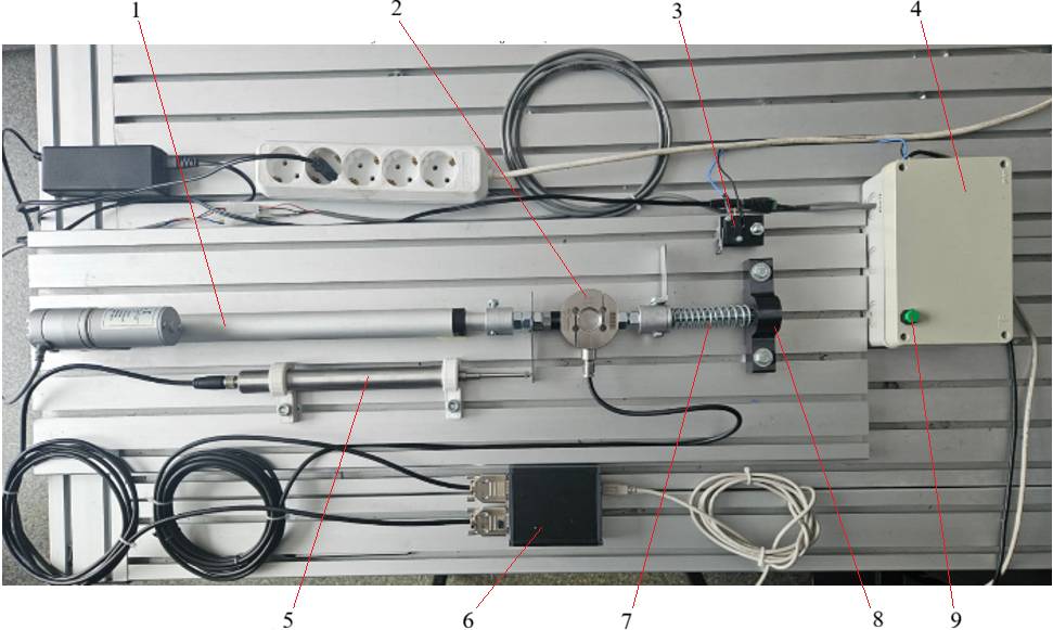 Semnificații notații: 1 - servosistem electric de încărcare, 2 - senzor de măsurare a forței, 3 - limitator de cursă, 4 - bloc de comandă servomotor de încărcare, 5- senzor de măsurare a deplasării, 6 - bloc de procesare a semnalelor de la senzori, 7 - arc de testat, 8 – suport de rezemare a arcului, 9 – buton de STOP. În fig. c, d se evidențiază zona centrală a dipozitivului de măsurare cu arcul neîncărcat (liber) și, respectiv, încărcat aproape de blocare.
