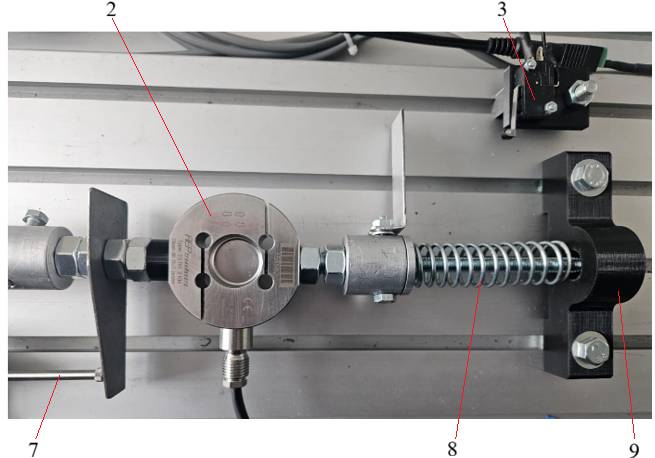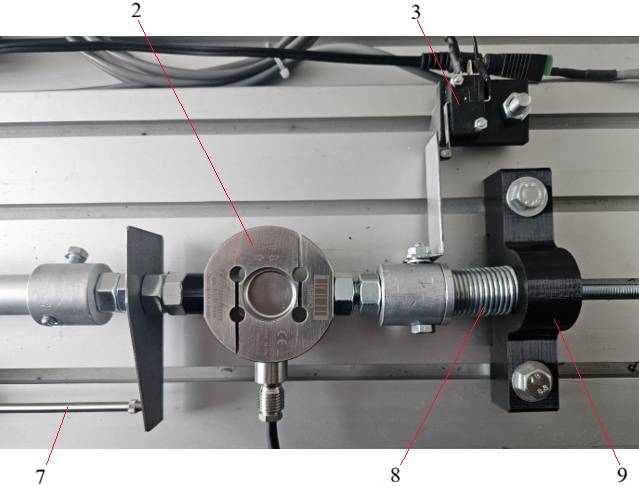 e Servosistemul linar de încărcare (1) este antrenat de un servomotor electric de current continuu are cursa de lucru 304 mm (Anexa.LE.03.01). Senzorul de deplasare (7) are cursa de măsurare 200 mm (Anexa.LE.03.02). Senzorul de forță (2) permite măsurarea forțelor cu valor mai mici decât 5 kN (Anexa.LE.02.06). |