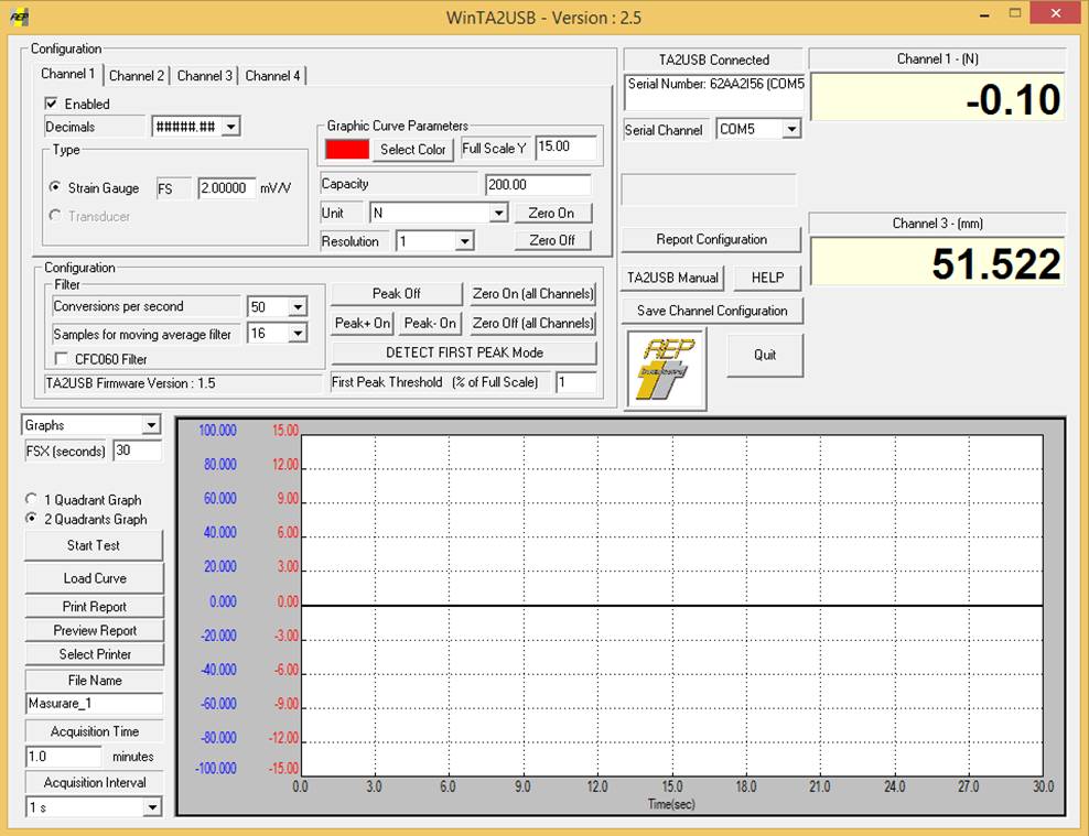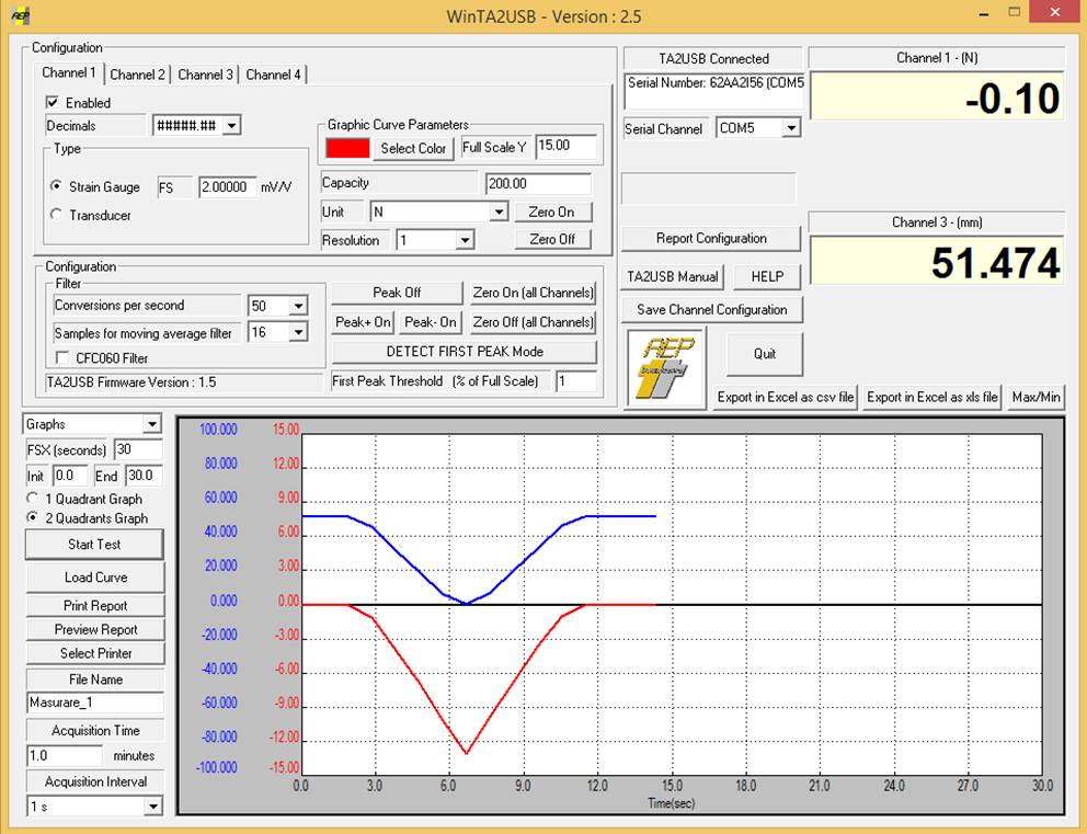 c Configurarea canalelor de achiziție a semnalelor - Configurarea canalului semnalelor de la senzorul de forță ż - Configurarea canalului semnalelor de la senzorul de deplasare ż - Introducerea valorii timpului maxim al achiziției [se va introduce în caseta - Introducerea valorii intervalului de achiziție a semnalelor [se va introduce în caseta - Selectare reprezentare grafică pentru cele două semnale [se va active cu ż opțiunea