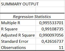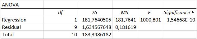 Aprecieri privind rezultatele statistice de regresie Coeficientul de determinare, R2 = 0,995 ca măsură a concentrării (ajustării, potrivirii) punctelor experimentale în jurul dreptei de regresie exprimă procentul, 99,5% care arată cât din dispersia (varianța) variabilei F se regăsește (influențează) în variabila δ. Deci, se poate aprecia o corelare foarte puternică a variabilelor F și δ. Coeficientul de corecție multiplă, Multiple R, pentru mai multe variabile independente nu este relevant în acest caz (cu o singură variabilă independentă. Coeficientul de determinare corectat , Ajusted R Square = 0,99, este introdus pentru a contracara parțial, efectul creșterii, unori nejustificat, a coeficientului R2 (R Square) care apare în cazul numărului variabilelor independente mărit (pentru regresii multiple); în cadrul acestei aplicații acest coeficient nu este relevant. Eroarea standard a estimaţiei, Standard Error = 0,42, este o măsură a dispersiei variabilelor dependente estimate în jurul mediei; astfel cu cât punctele norului sunt mai aproape de linia de regresie cu atât valorea estimației erorii standard este mai mică. valorea mică a erorii standard din acest caz arată că modelul de regresie este precis. Concluzie (decizie) test F: deoarece, Significance F < α (0.0001 < 0.05) testul este semnificativ, ipoteza nulă (H0) este respinsă și se acceptă ipoteza alternativă (H1) cu probabilitatea p = 0,05 (95%) și deci, modelul de regresie este puternic semnificativ (relevant).