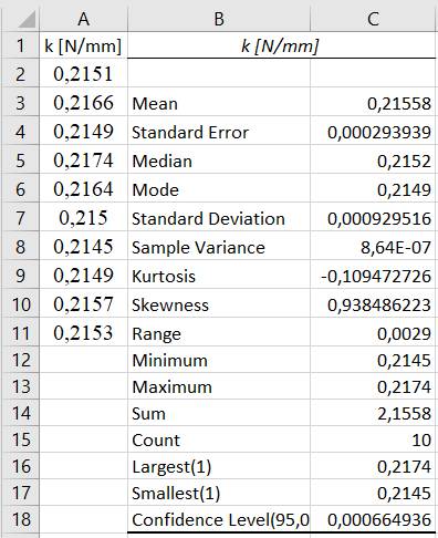 Analiza descriptivă a datelor (valorile rigidității k; fig.e), obținute prin repetarea experimentului de 10 ori, se face cu funcția Descripive statistics din modulul Data Analysis (Ghid.Ap.2.10). În fig.f se prezintă tabelar valorile indicatorilor statistici obținuți: Mean (Media), Standard Error (Eroarea Standard), Median (Mediana), Mode (Modul), Standard Deviation (Deviația Standard), Sample Variance (Dispersia, Varianța), Kurtosis (Boltirea), Skewness (Asimetria), Range (Amplitudinea), Minimum (Minimul), Maximum (Maximul), Count (Numărul de valori), Confidence Level (Intervalul de încredere (95%).