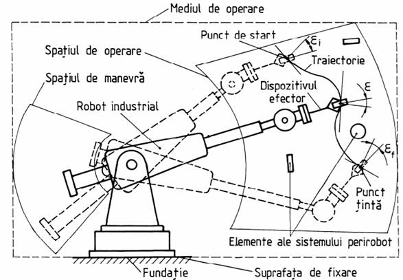 generală a sistemului robot În oricare situație de utilizare a unui robot industrial se impune parcurgerea unui set de traiectorii între punctele de start și țintă din spațiul de operare (fig.1), pentru poziționarea și orientarea controlată a obiectului de manipulat în mediul tehnologic (de operare).