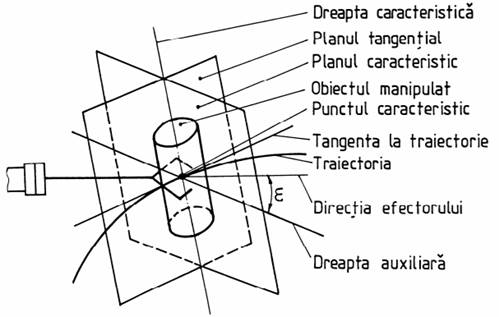 Fig. 2 - Geometria orientării corpului manipulat Obiectul manipulat poate fi un semifabricat/piesă, care este adus pentru a fi prelucrat/asamblat sau respectiv evacuat după prelucrare, sau o sculă/dispozitiv de lucru sau de inspecție (pistol de vopsire, cap de sudare, dispozitiv de înșurubare, polizor de debavurare, aparat/instrument de măsură etc.). Obiectul manipulat, conform succesiunii tehnologice, se poate găsi în staționare, cu sau fără acțiune tehnologică, sau în mișcare pe traiectorii definite. Pentru descrierea sintetică a poziției și orientării obiectului manipulat cu viteze și accelerații impuse în cadrul mișcării generale, acesta se reduce la un punct caracteristic și o dreaptă caracteristică (fig. 2). De obicei, se adoptă ca dreaptă caracteristică, dacă există, una din axele de simetrie ale obiectului de manipulat și ca punct caracteristic centrul de simetrie (când sunt mai multe axe de simetrie), un punct de pe axa de simetrie (când există o singură axă de simetrie) sau centrul de masă. Traiectoria (fig.1 și 2), ca o secvență distinctă asociată unei faze tehnologice, ținând cont de poziția obstacolelor (elemente ale sistemului perirobot), este locul geometric al pozițiilor succesive ale punctului caracteristic, în mișcare. Orientarea obiectului manipulat în punctele curente ale traiectoriei se descrie de poziția direcției planului tangențial, format de dreapta caracteristică și tangenta la traiectorie, prin unghiul de orientare (operare, de lucru) ε, dintre normala la acest plan (dreapla auxiliară) și direcția efectorului robotului. Planul determinat de dreaptele caracteristică și auxiliară se numește plan caracteristic. Mulțimea punctelor din mediul de operare al unui robot industrial (fig.1) care pot fi atinse de punctele caracteristice ale obiectelor de manipulat, formează spațiul de operare (de lucru). Pe de altă parte, mulțimea punctelor din mediul de operare atinse de punctele extreme ale robotului industrial formează spațiul de manevră. Suprafața de fixare a unui robot industrial este suprafața de legătură a bazei cu fundația, față de care se definește și sistemul de coordonate fix asociat robotului industrial. Structura