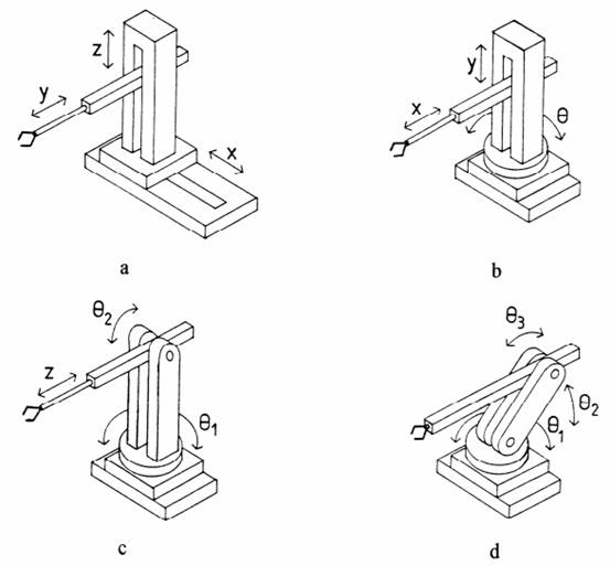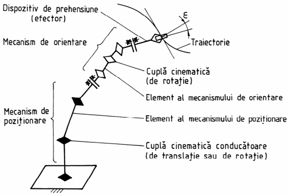 Fig. 4 - Structura sistemului mecanic a unui robot fix serie Pentru ghidarea completă a dispozitivului efector cu obiectul manipulat în spațiul de operare tridimensional, fără obstacole, sunt necesare minumum șase grade de libertate (mișcări independente) ale acestuia, dintre care trei sunt de poziționare (generatoare de traiectorie) și celelate trei sunt pentru orientare. Gradul de mobilitate al structurii mecanice a unui robot industrial este dat de numărul coordonatelor independente necesare pentru definirea neechivocă a pozițiilor tuturor elementelor acestuia. Pentru sistemul mecanic corespunzător unui robot industrial serie, standard, în vederea realizării mișcărilor de poziționare și de orientare a mecanismului efector sunt necesare șase grade de mobilitate, dintre care trei sunt asociate lanțului cinematic de poziționare și celelalte trei sunt ale lanțului cinematic de orientare. Roboții industriali construiți pentru operații tehnologice de complexitate redusă, în multe cazuri practice, din considerente de eficiență efectuează mai puține mișcări independente asupra dispozitivului efector și, deci, au mai puține grade de mobilitate. Mecanismele de poziționare cu trei grade de mobilitate, în funcție de tipul coordonatelor care descriu pozițiile și mișcările diverselor elemente ale, frecvent în practică, definesc structurile de bază de roboți: în coordonate carteziene (fig.5,a), cilindrice (fig.5,b), sferice (fig.5,c) sau unghiulare (fig. 5.d).