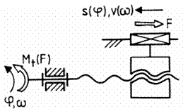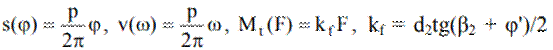 a b Fig. 1 Cupla elicoidală cu alunecare: a schema funcțională; b cupla elicoidală (filet) cu alunecare Semnificații notații: s(φ) și v(ω) - deplasarea și viteza axială rezultate la rotirea elementului antrenor cu unghiul φ și, respectiv, cu viteza unghiulară ω; φ(s), ω(v) rotirea și viteza unghiulară obținute la deplasarea antrenorului pe distanța s și, respectiv, cu viteza de intrare; d2 - diametrul mediu al filetului (fig.1,b), d1 - diametrul interior al filetului, d - diametrul nominal al filetului, Mt(F) = kf F momentul de intrare dependent de forța rezistentă F; kf = d2tg(β2 + φ')/2 pentru sensul de înșurubare și kf = d2tg(β2 - φ')/2 pentru cel de deșurubare, în care β2 = arctg(p/πd2), unghiul mediu al filetului și φ' = arctg(μ/cos(α/2)), unghiul de frecare redus (μ coeficientul de frecare de alunecare din filet, α unghiul profilului filetului). Transformarea și transmiterea mișcărilor și, respectiv, forțelor având la bază proprietatea mișcării în cupla elicoidală cu pas constant, materializată de filet, se definesc cu relațiile: