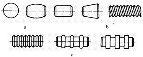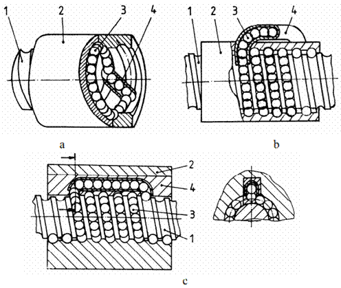 Fig. 2 Construcția cuplelor elicoidale cu rostogolire: a recircularea prin fluxuri paralele; b,c recircularea printr-un flux peste mai multe spire Semnificații notații: 1 - șurub cu una, două sau trei căi de rulare elicoidale; 2 - piulița, prevăzută cu o cale de rulare elicoidală la interior; 3 - corpurile de rostogolire (de obicei, bile); 4 - subansamblul de recirculare a corpurilor de rostogolire. De obicei, recircularea peste o spiră se realizează în interiorul cuplei prin intermediul unei piese cu unul sau două canale de ghidare adecvate. Recircularea peste mai multe spire se poate face prin corpul piuliței (fig. 2,c) sau prin exteriorul acestuia (fig. 2,b), soluțiile fiind aplicabile și în cazul șuruburulor cu mai multe începuturi. Formele căilor de rulare, precum și soluțiile constructive ale cuplelor elicoidale cu rostogolire, în principal, se diferențiază în funcție de tipul corpurilor de rostogolire, care pot fi bile sau role cilindrice, butoi, conice (fig. 3,a) și profilate - filetate (fig.3,b) sau circulare (fig. 3,c). Transmisiile șurub-piuliță cu role au capacitatea portantă mărită de câteva ori față de cele cu bile și, în plus, o mai mare capacitate de amortizare, toate acestea la gabarite radiale și axiale mai mari și la randamente mai scăzute.