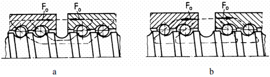 corpurile de rulare, atât la mersul în gol cât și în sarcină, prin: - montarea cu strângere (pretensionare) a corpurilor de rostogolire între căile de rulare ale piuliței și șurubului pentru soluțiile din fig. 5 și 4,b,c. - realizarea de subansamble piuliță cu două seturi de corpuri de rostogolire pretensionate prin apropierea semipiulițelor, montaj în "X" (fig. 6,a și 7), sau prin îndepărtarea acestora, montaj în "O" (fig. 6,b și 7).