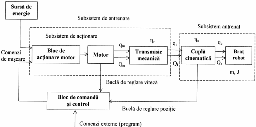 rolul servomotoarelor de acționare  În fig. 1 se prezintă schema bloc a unui sistem de antrenare a unei cuple cinematice. Motorul antrenează cupla cinematică prin intermediul unei transmisii mecanice, care are rolul de a adapta componentele puterii mecanice (viteza și sarcina) de la ieșirea din acesta qm, Qm (ωm, Mm sau vm, Fm), la cele ale subansamblului antrenat - de exemplu, cupla și brațul unui robot cu parametri qi, Qi (ωi, Mi sau vi, Fi) și, respectiv, qe, Qe (ωe, Me sau ve, Fe). Pe de altă parte, motorul este cuplat la un bloc de comandă, care asigură reglarea vitezei și/sau sarcinii, precum și a unor funcții de protecție. Motorul împreună cu blocul de comandă asociat formează subsistemul de acționare, care are ca parametri de intrare energia de acționare și comenzile de deplasare și ca parametri de ieșire mișcarea și forța motoare impuse. Subsistemul de acționare împreună cu transmisia mecanică formează subsistemul de antrenare.