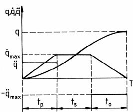 Fig. 2 Legi de mișcare cu accelerație constantă Durata unei mișcări, în principal, depinde de accelerație - dependentă la rândul ei de masele și momentele de inerție ale elementelor mobile - și de distanța parcursă. Deci, din aceste considerente, comenzile roboților ar trebui să fie modificabile (adaptabile), deoarece traiectoria realizată cu obiectul de manipulat este diferită de la un ciclu de lucru la altul, inerțiile reduse la arborele motor fiind dependente de pozițiile succesisve ale brațelor robotului. Astfel, pentru urmărirea rapidă și precisă a legii teoretice de mișcare cu parametri specificați, sunt necesare sisteme de comandă autoadaptive, care să ajusteaze în timp real parametri de comandă prin bucle de reacție. Comenzile în poziție, frecvent întâlnite în practică, implică următoarele tipuri de legi de mișcare: -