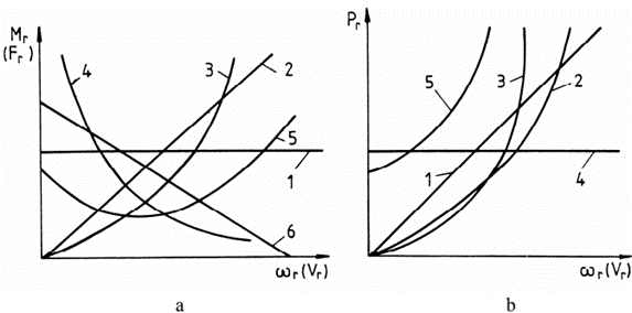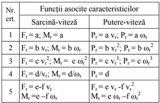 duratei de mișcare cunoscând caracteristicile de acționare;  - determinarea parametrilor de acționare (accelerație și viteză) necesari pentru efectuarea mișcării în intervale de timp date. Caracterstici mecanice de tip sarcină-viteză Sarcina rezistentă (forță sau moment) din subsistemul antrenat, necesar a fi învinsă de subsistemul de antrenare, este variabilă cu viteza prin dependențe de forma Fr = Fr(vr), pentru cazul subsistemului cu mișcare de translație, sau Mr = Mr(ωr), când mișcarea acestuia este de rotație, numite caracteristici mecanice de tip forță-viteză liniară sau, respectiv moment-viteză unghiulară. Uneori, pornid de la aceste caracteristici, descrierea comportării subsistemului antrenat se poate face și prin dependența putere-viteză Pr(vr) = vr Fr(vr) sau respectiv Pr(ωr) = ωr Mr(ωr). Funcțiile asociate diverselor caracteristici sarcină-viteză și putere-viteză, posibil a fi întâlnite în practică sau a fi considerate pentru calcul, sunt prezentate în tabelul 1. În fig. 2,a și b se prezintă aluri ale graficelor asociate caracteristicilor sarcină-viteză și, respectiv, putere-viteză din tab. 2, numărul asociat acestora fiind în corespondență cu numărul curent din tabel. Valorile constantelor a f associate funcțiilor caracteristice se determiă în funcție de tipul, structura și dimensiunile subsistemului antrenat.