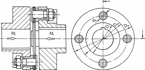 cu rigiditate torsională mărită Aceste cuplaje elastice caracterizate de rigiditate torsională mărită, cu posibilități de compensare a abaterilor axiale, radiale și unghiulare, datorită flexibilității în plan transversal (frontal) a elementului elastic, sunt adecvate pentru subsistemele mecanice de antrenare a cuplelor roboților. În fig. 1 se prezintă soluția constructivă a cuplajului cu discuri flexibile care realizează transmiterea în paralel a fluxului de forță de la cele două bolțuri montate în locașurile semicuplajului conducător la alte două bolțuri solidarizate cu semicuplajul condus, prin intermediul unui unui pachet de discuri inelare. Rigiditatea torsională, precum și flexibilitatea transversală, sunt influențate de configurația discurilor (fig. 1, discuri circulare; fig. 2 și fig. 3, necirculare). Pentru mărirea flexibilității transversale, se pot adopta soluții constructive cu discuri neconcentrice, cu alezajele bolțurilor conducătoare și conduse poziționate pe cercuri diferite (fig. 2,a) sau cu element intermediar compus din sectoare (fig. 2,b).