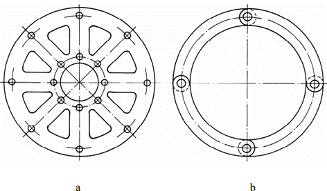 Fig. 3 Discuri flexibile neconcentrice și sectoriale În fig. 4 se prezintă cuplaje flexibile cu tuburi gofrate care pentru fixarea pe arbori, utilizează șuruburi dispuse radial (fig. 4,a), în cazul momentelor de torsiune mici (cuplaje cinematice), sau șuruburi tangențiale (fig. 4,b), pentru momente de torsiune mai mari.