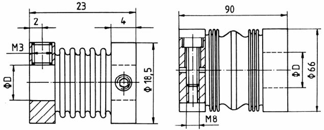 Fig. 4 Cuplaje flexibile cu tuburi gofrate Specifice transmisiilor mecanice ale sistemelor mecatronice sunt și cuplajele flexibile monobloc cu fante radiale (fig. 5). Pentru a se asigura cu precizie mărită legarea acestor cuplaje la arborii conducător și condus se pot folosi asamblări prin fricțiune cu strângere cu șurub tangential (fig. 5,a), la momente de torsiune mici, sau cu inele tronconice și șuruburi axiale (fig.5,b), la momente de torsiune mari.