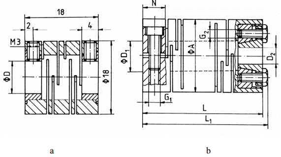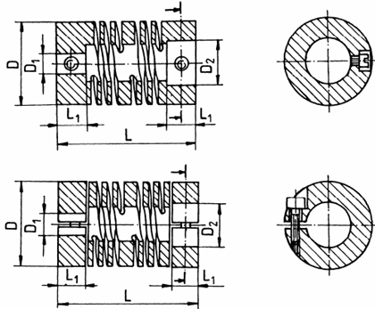 Fig. 5 Cuplaje flexibile monobloc cu fante radiale În cazul sistemelor mecanice ale produselor mecatronice când momentul de torsiune transmis de cuplaj este nesemnificativ, dar se impune precizie mărită (de exemplu, cuplarea traductoarelor de rotație), pentru transmiterea mișcării se utilizează cuplaje flexibile cinematice. În fig. 6 se prezintă două variante de cuplaje flexibile cu fante elicoidale. Aceste variante pot fi cu fixare pe arbore cu șuruburi radiale (fig.6,a) sau cu șuruburi tangențiale (fig. 6,b).