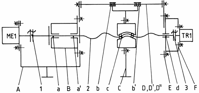 Fig. 1 Schema structural-constructivă a modulului de translație cu șurub-piuliță Semnificații notații: 1 și 3 - cuplaje flexibile; 2 - șurub, a și a' - lagărul principal cu rulmenți; b și b' - lagăre de translație b și b'; c - cupla elicoidală; d  lagăr de rotație secundar; A și E - suporți; B și F - carcase; D, D', D"  coloane de ghidare; C  piuliță împreună cu corp lagăr; ME1- servomotor electric; TR1 - traductor incremental de rotație. Pornind de la cerințele implicate de necesitățile unui sistem mecatronic, sau adoptat: cuplaje flexibile (insensibilitate la abaterile axelor arborilor) cu rigiditate torsională mărită; lagăre cu rulmenți cu bile; cuplă elicoidală cu rostogolire; ghidaje cu rostogolire cu bucși cu bile  |