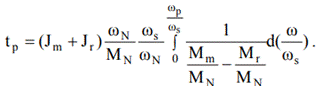 unde, Mm, Jm sunt momentul motor și momentul de inerție al motorului și Mr, Jr - momentul rezistent și momentul de inerție al subsistemului antrenat, reduse la axa arborelui motorului. Deoarece în punctul de funcționare N (fig.3,a), determinat de intersecția caracteristicilor sarcină-viteză ale motorului și subansamblului antrenat, Mm  Mr = 0, teoretic timpul de accelerare tinde la infinit, cu valori ale vitezei unghiulare ω foarte apropiate de viteza unghiulară de regim staționar ωs (fig.3,b). Însă, pentru a se determina timpul de accelerare, evitând această nedeterminare, practic se consideră că sistemul de antrenare s-a accelerat când viteza unghiulară ω atinge valoarea ωp = (0,95 0,99)ωs.