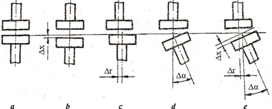 Fig. 3 Abateri de la coaxialitatea arborilor legați de cuplaje: a - poziție de referință; b axială (Δx); c radială (Δr); d unghiulară (Δα); e - combinată