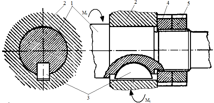 Obs. Momentul de torsiune se transmite prin formă, conform fluxului: 1 -> 3 -> 2; 1 - arbore, 2 - butuc, 3 - pană disc; fixarea axială a butucului 2 se face cu piuliţa 4 asigurată împotriva deşurubării cu contrapiuliţa 5. |