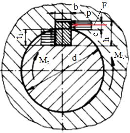 unde, Mt [Nmm] reprezintă momentul de torsiune care încarcă asamblarea, d [mm] – diametrul arborelui, h [mm] – înălţimea penei (se adoptă din Stas 1012, în funcţie de diametrul, d, al arborelui), D [mm] – lungimea de calcul a penei; c [mm] – lăţimea zonei de contact cu butucul; σas [MPa] – tensiuninea admisibilă la strivire a asamblării (fer. APP-M.1). Condiţia