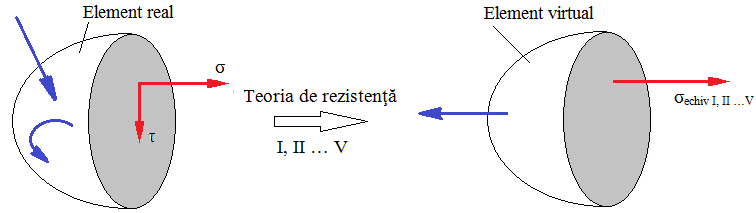 În acest caz se impune determinarea unei tensiuni echivalente care apare într-un element imaginar (virtual) supus la întindere, din acelaşi material, şi care produce o stare de solicitare cu tensiunea σ tot atât de periculoasă (echivalentă) ca şi cea reală cu tensiuni σ şi τ. Tensiunea echivalentă se determină, pe baza unor criterii de echivalare numite teorii de rezistenţă (tab. PRC-T.3.1.5.1.2.2) şi se compară cu tensiuni admisibile (PRC-T.3.1.5.1.2.1) bazate pe tensiuni limită, uşor de determinat experimental. Solicitări compuse posibile: încovoiere şi răsucire; tracţiune, încovoiere şi răsucire |