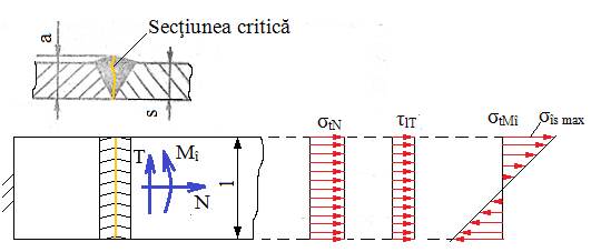 Ipoteze de calcul: - acţiunea forţei longitudinale N determină în cordonul de sudură tensiuni normale de tracţiune transversale, σtN; - acţiunea forţei transversale T determină în cordonul de sudură tensiuni de forfecare longitudinale, τlT; - acţiunea momentului de încovoiere, Mî, determină în cordonul de sudură tensiuni normale de tracţiune/compresiune transversale, σtMî cu maximul σîs max; - secţiunea critică se consideră dreptunghiulară cu lungimea lcs = l-2a (nu se iau în considerare porţiunile de cap unde cordonul de sudură este incomplet) şi lăţimea, a ≈ s (nu se ia în considerare concavitatea). Condiţia de rezistenţă a sudurii, (conform rel. SUD-T.8.1.2):