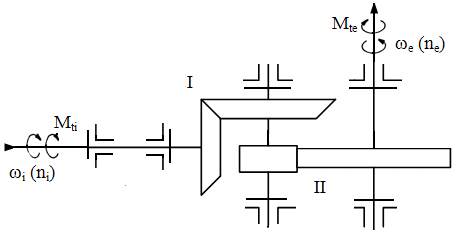 Structura funcţională: I – angrenaj conic ortogonal cu raportul de transmitere iI; II – angrenaj cilindic cu raportul de transmitere iII . Funcţia de transmitere a puterii: