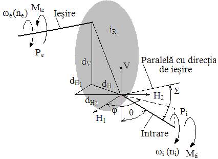 după axele H1 şi, respectiv, H2 ( θ – unghiul direcţiei punctelor de intrare şi de ieşire faţă de verticală (axa V); φ – unghiul proiecţiei direcţiei punctelor de intrare şi de ieşire în plan orizontal faţă de axa H1; Σ – unghiul dintre axele de intrare şi de ieşire; ωi (ni) – viteza unghiulară (turaţia) de intrare ωe (ne) – viteza unghiulară (turaţia) de ieşire; iR – raportul de transmitere total, iR = ωi / ωe = ni/ne; ηR –